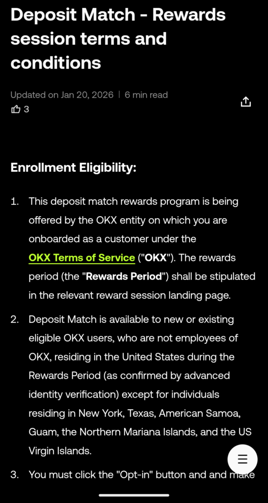 Link to offer: No direct link to offer. In the OKX App you should see the offer, or navigate to “Rewards” in the Gifts and Rewards section. On the website navigate to “Rewards” under Others while logged in. I was having issues on the website enrolling in the offer, so the App may be better YMMV.