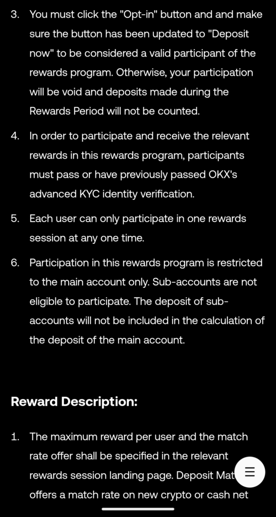 - In order to participate and receive the relevant rewards in this rewards program, participants must pass or have previously passed OKX’s advanced KYC identity verification.