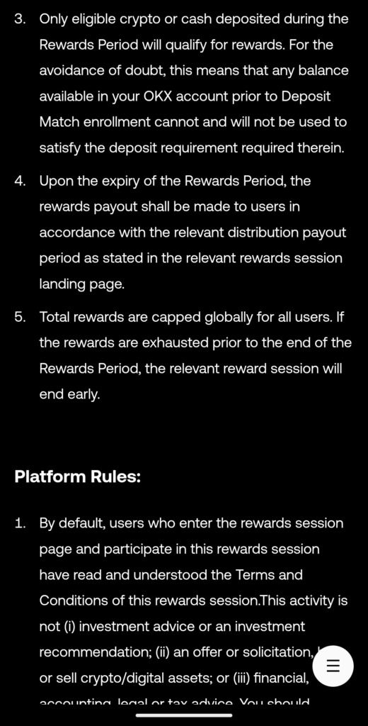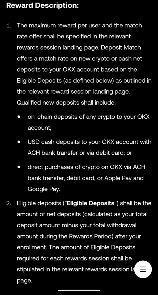 - This deposit match rewards program is being offered by the OKX entity on which you are onboarded as a customer under the OKX Terms of Service (“OKX“). The rewards period (the “Rewards Period“) shall be stipulated in the relevant reward session landing page.